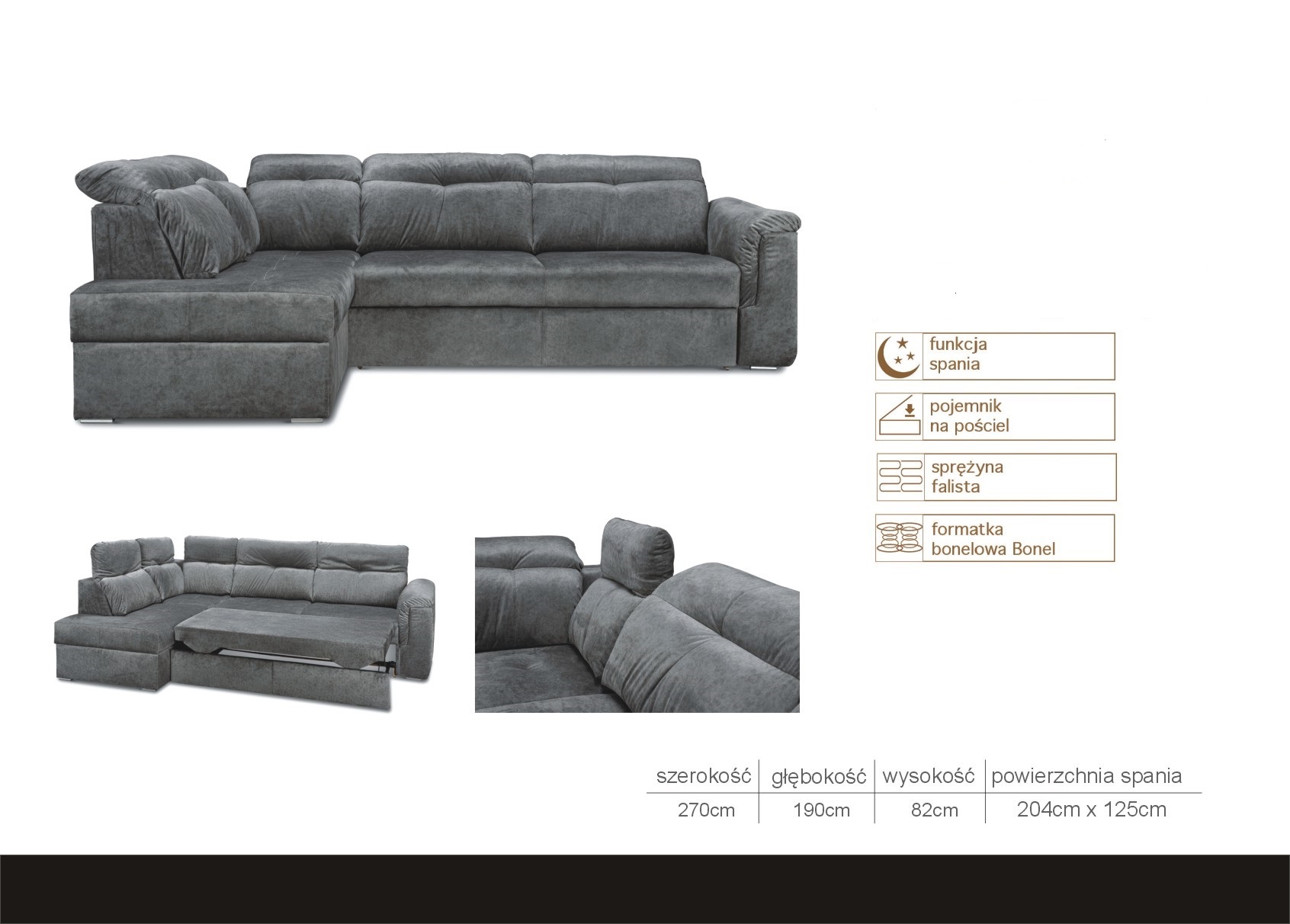 Narożnik rozkładany doskonale sprawdzi się w dużych pomieszczeniach, w których zapewni sporo miejsca siedzącego. Z kolei po rozłożeniu przeobrazi się w wygodne łóżko dla dwóch osób. Narożnik został wykonany z wysokiej jakości komponentów oraz posiada dwa pojemniki na pościel. Ponadto dostępny jest w szerokiej gamie kolorystycznej.