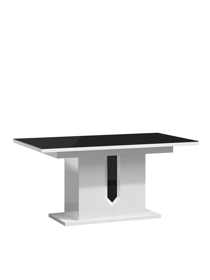 Unikalna estetyka opiera się na kontrastowym połączeniu bieli w wysokim połysku z eleganckim czarnym szkłem. Subtelna wstawka w formie „krawatu” dodaje stołowi charakteru, podkreślając nowoczesny styl. Solidna konstrukcja z płyty MDF i laminowanej gwarantuje stabilność i trwałość przez lata.